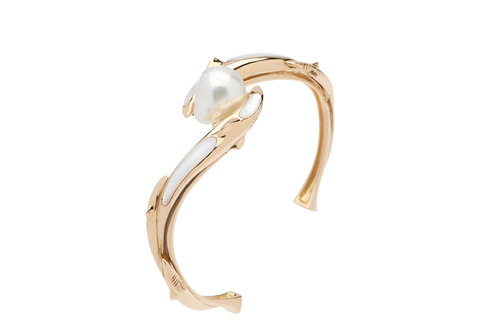 A cuff bracelet featuring three Great White Sharks with mother of pearl inlay, circling a central Baroque South Sea Pearl.