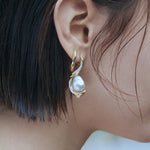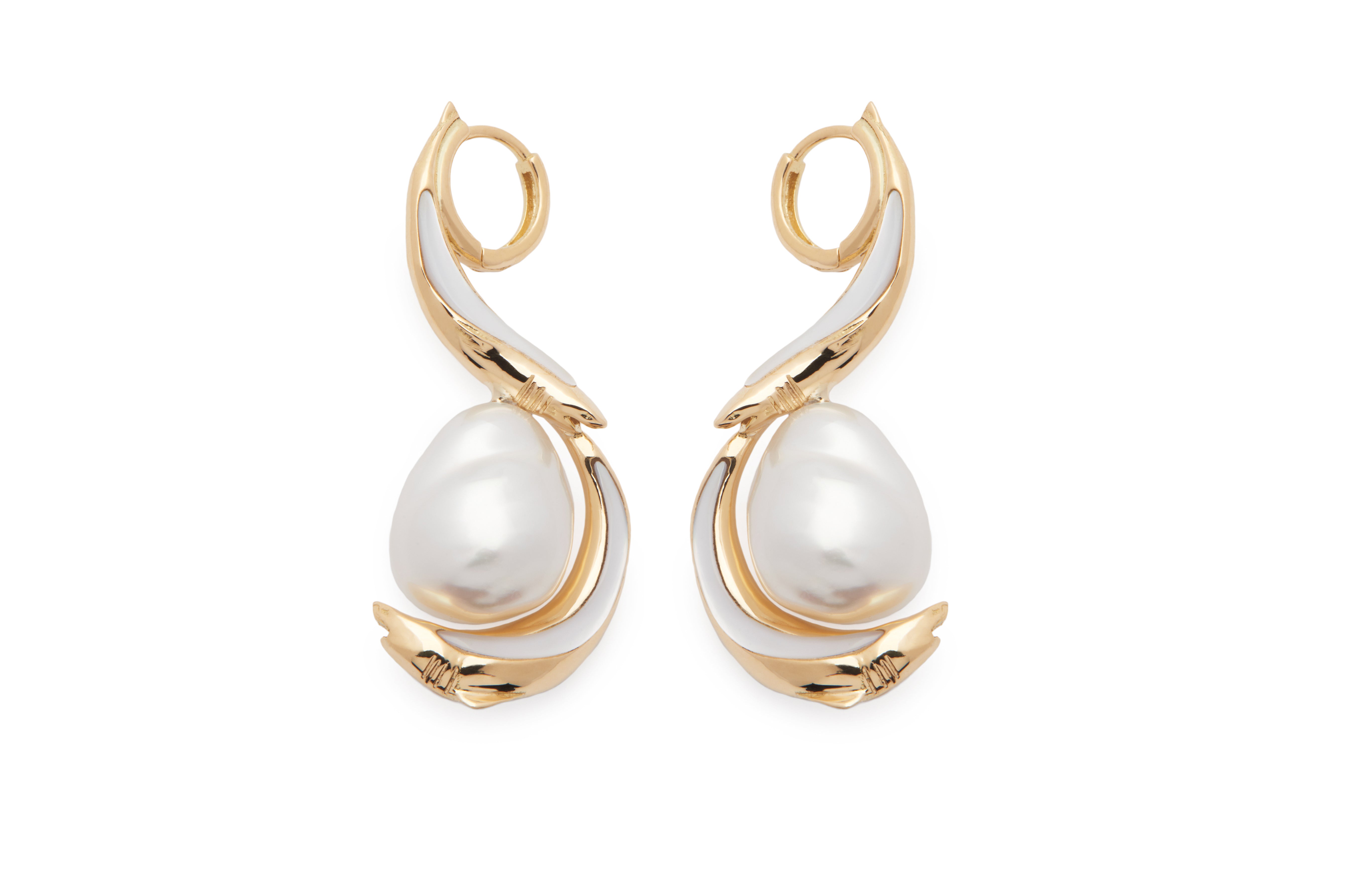 A pair of earrings featuring two Great White Sharks gracefully twisting around a Baroque South Sea Pearl.