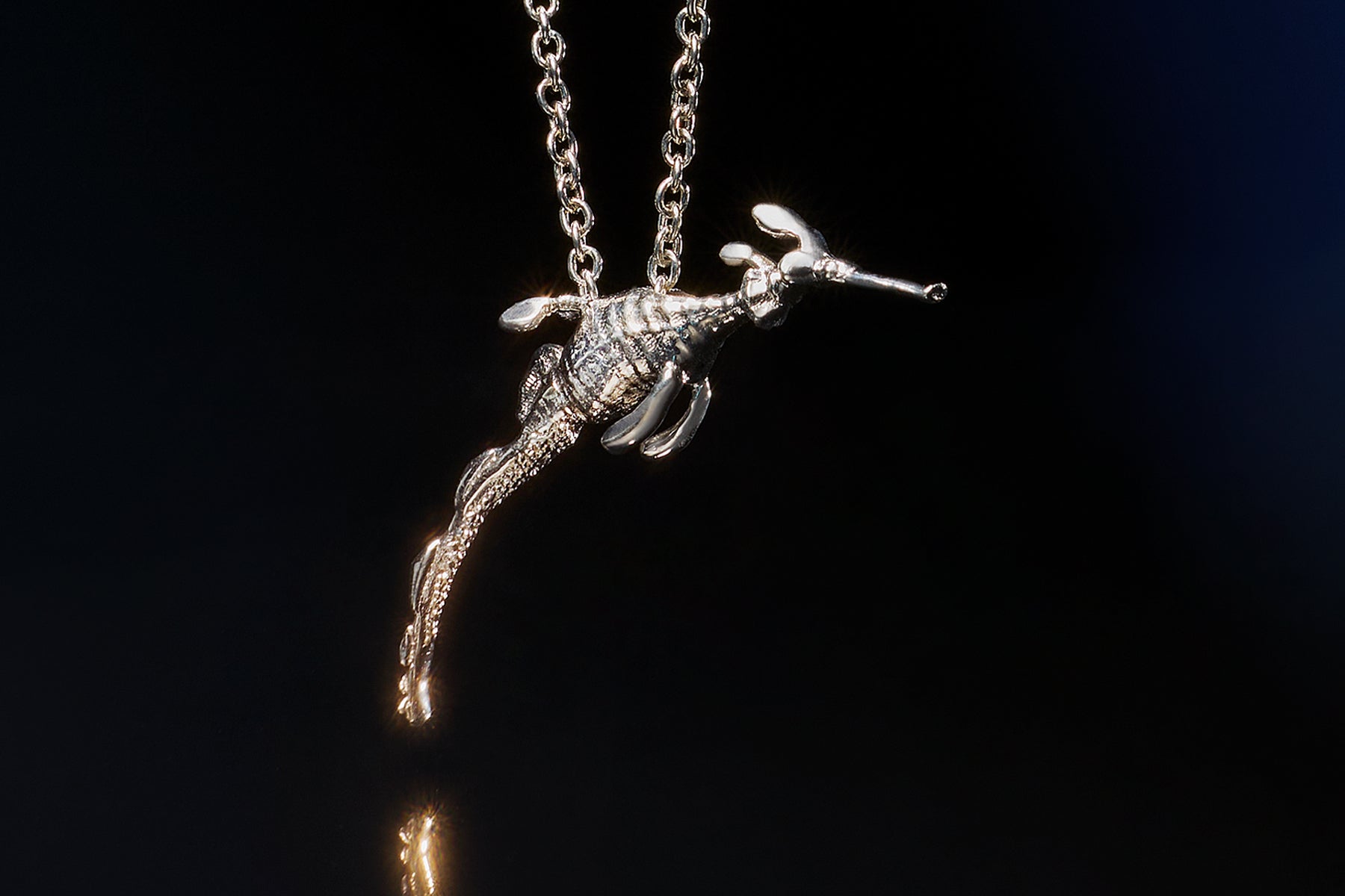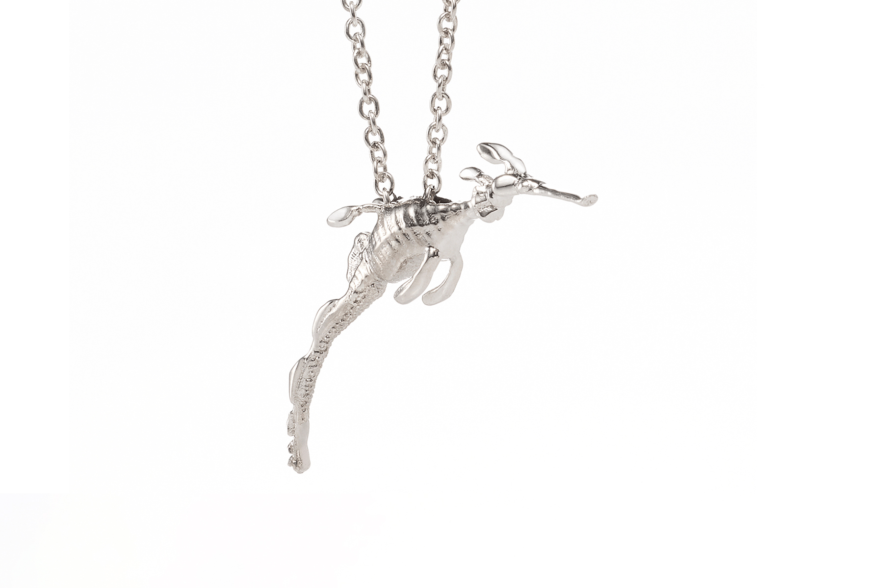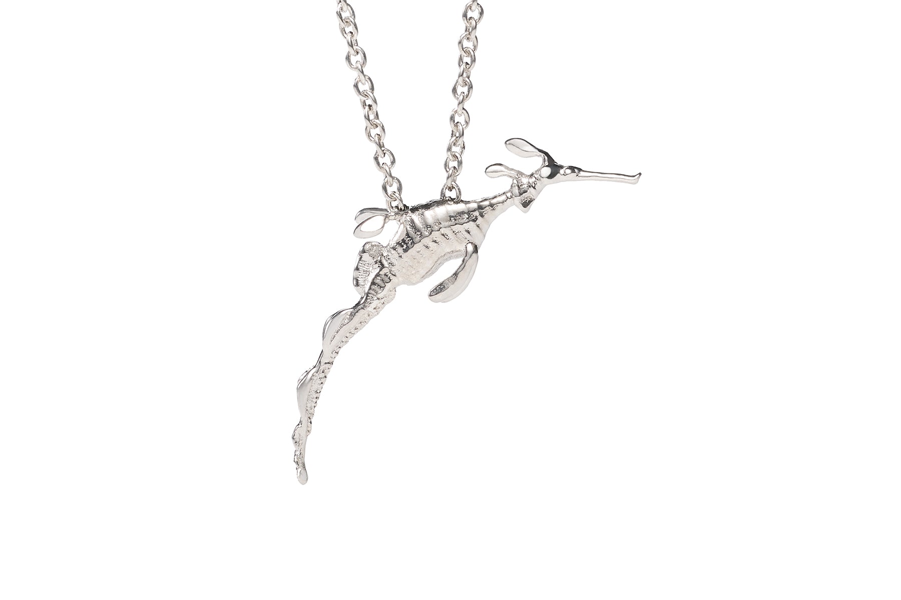 Modeled off a real-life Weedy, the JORDAN ASKILL for SEADRAGON CONSERVATION Weedy Seadragon Pendant is crafted from sterling silver as a hyper-real representation of this ethereal and elusive creature. The chain is engineered to go through the body of the pendant, so the three-dimensional Weedy Seadragon slides with suspended ease. The Weedy pendant, gliding through the water column, is imbued with a sense of magical realism and depicted as if frozen in time.